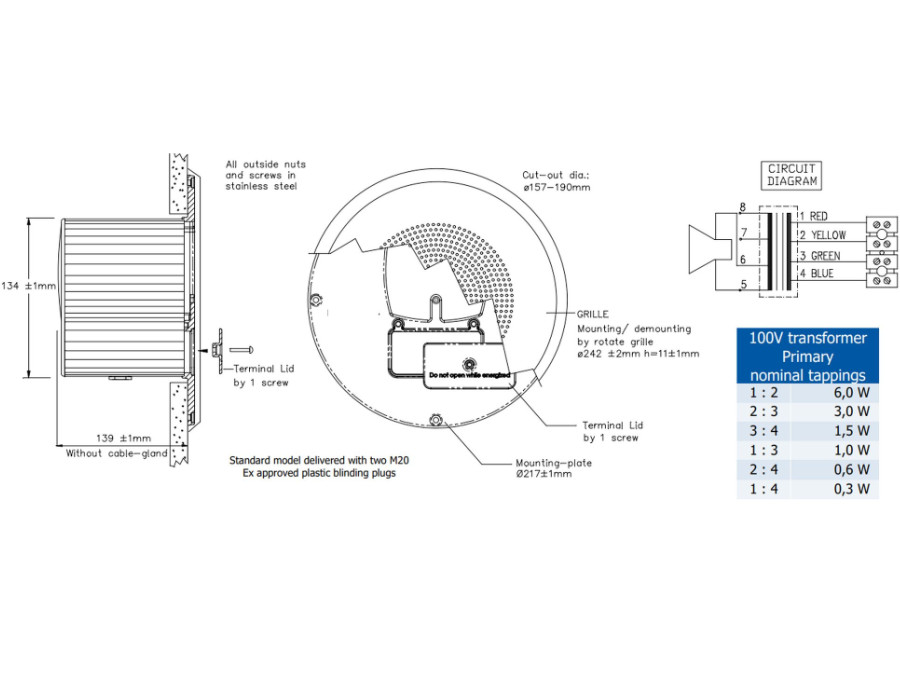 | Durchführung | 1 x M16 (Rundkabel-Durchmesser = 4 bis 9 mm) |